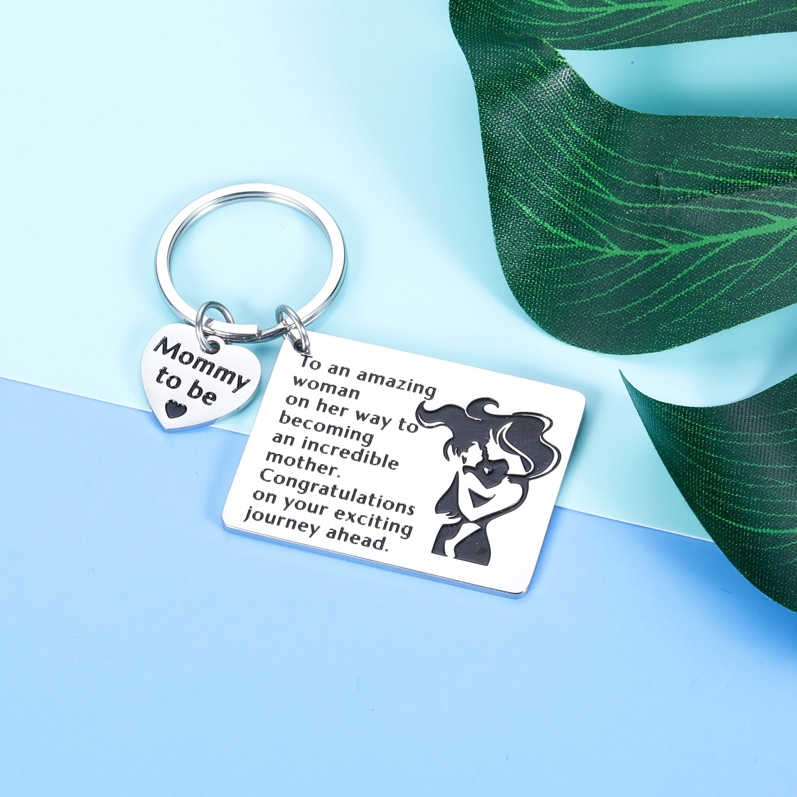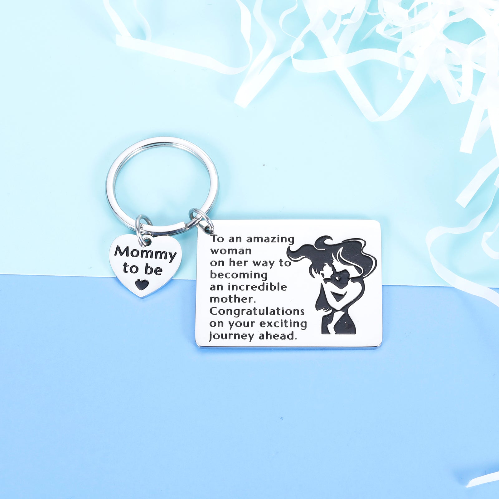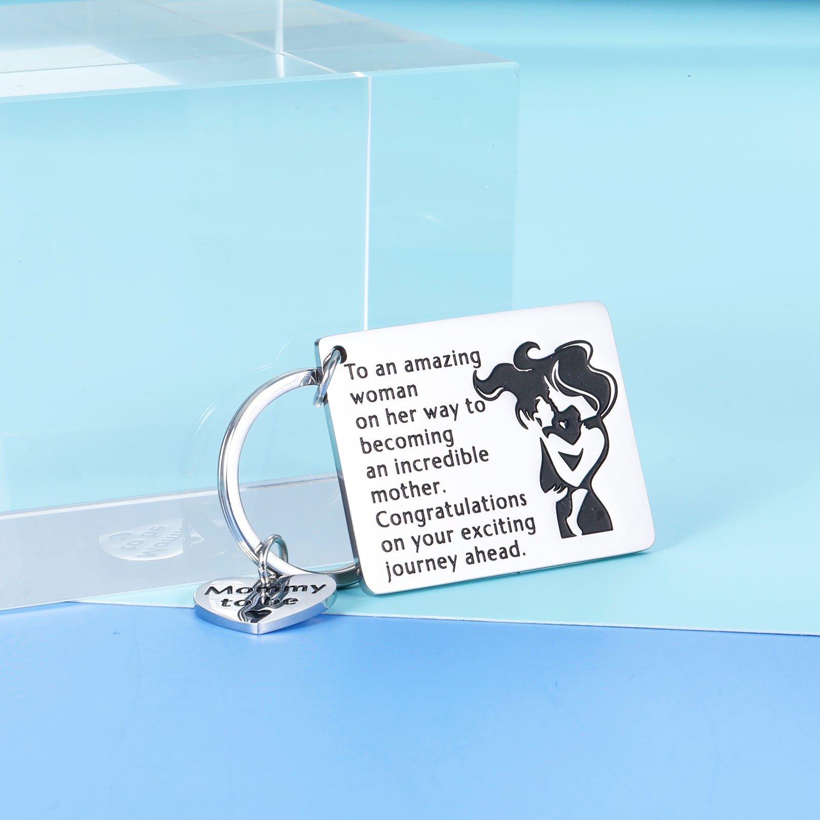 “To an amazing woman on her way to becoming an incredible mother. Congratulations on your exciting journey ahead--Mommy to be”keychain.