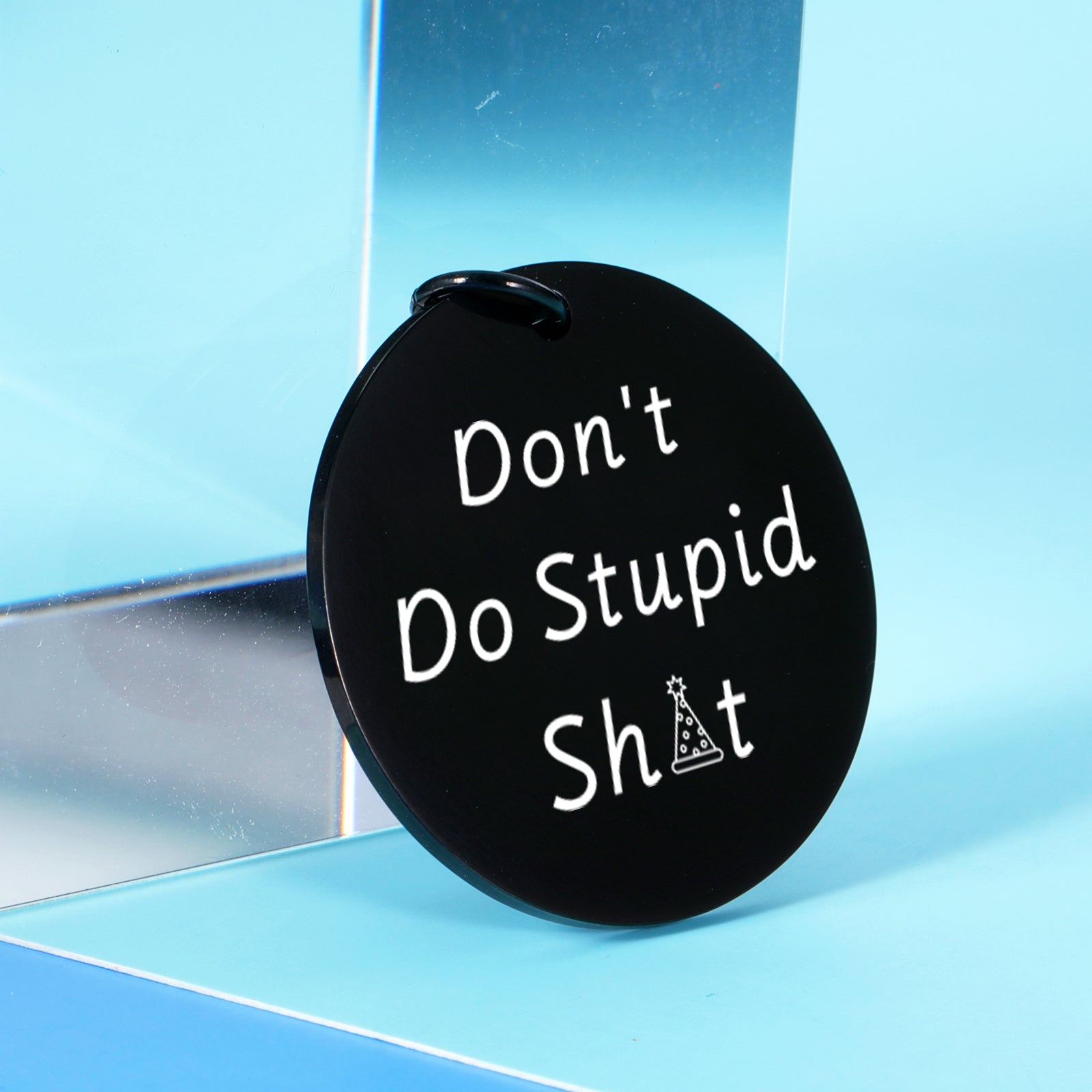 â„This is a double-sided keychain. One side engraved âDonât do stupid sh*tâ, the other side engraved âHappy 16th birthdayâ.